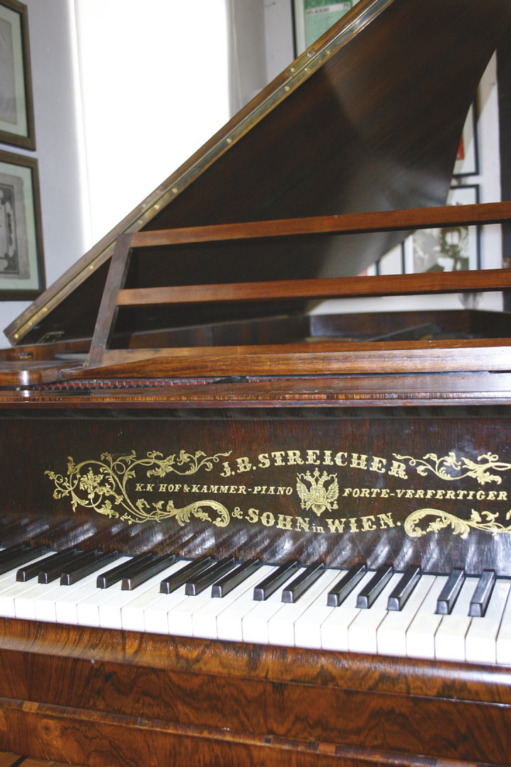 Kurzcharakteristik: Instrument Nr. 5886 (ergibt Baujahr 1861); die Familien Stein und Streicher gehörten für mehr als drei Generationen zu den wichtigsten Klavierbauern der Musikhauptstadt Wien. Goethe, Clara Schumann und Johannes Brahms spielten auf Streicher-Flügeln. Wiener Mechanik. Das in seiner Substanz gut erhaltene Instrument wurde von den Werkstätten für historische Tasteninstrumente J. C. Neupert in Bamberg im Sommer 2003 restauriert. Das nebenstehende Foto zeigt das Instrument im "Bergezustand".