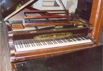 • Die Saitenspannung wird noch nicht durch einen gusseisernen Rahmen, sondern ausschließlich von zwei die Holzrastenkonstruktion unterstützenden Eisenstreben kompensiert.